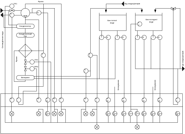 Регулятор ТС(4) управляє подачею фреону в випарники по сигналу від сенсора температури ТЕ (3) на зворотної лінії фреону і управляє двигуном МА1.