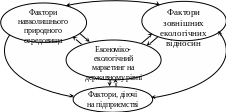Зазначимо, що на функцiювання економiко-екологiчного маркетингу можуть впливати не лише навколишє природне середовище, а й чинники економiчного оточення i фактори в межах пiдприємства.