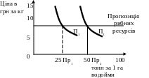 Спостерігаючи даний рисунок, бачимо, що попит задано кривою П1, а економічна рента на кількість риби становить Пр1, то при зростанні попиту до П2 економічна рента збільшується до Пр2. Отже, і при фіксованій ціні монополіста економічна рента збільшується з кількістю виловленої риби, але ж ціна не змінюється, населення менш купує рибу і менш її споживає. Це часто веде до зіпсування цінного продукту (риби) і збитку, що не матиме користі ні для покупців, оскільки більшість населення України не отримує грошей, ні для монополістів, котрі зберігають ціну незмінною і надто перевищують вартість риби.