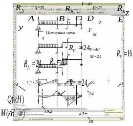Несущая часть балки АВС рассчитывается на действие распределений нагрузки q=15 кН/м и силы, численно равной опорной реакции балки СЕ RC=24 кН и направленной в противоположную сторону.