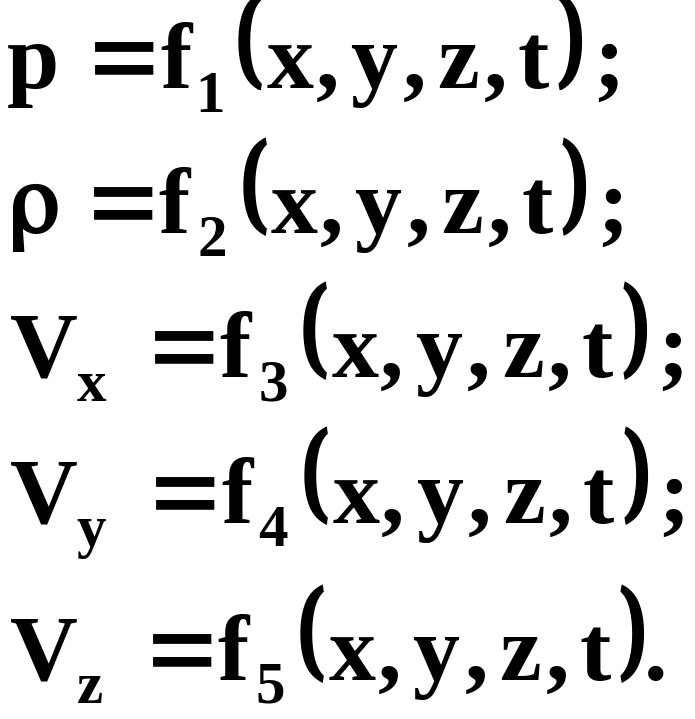 Чтобы полностью описать процессы взаимодействия при движении жидкости или тел в ней, НЕОБХОДИМО в каждой точке пространства, занятой жидкостью, знать ДАВЛЕНИЕ, ПЛОТНОСТЬ и СОСТАВЛЯЮЩИЕ СКОРОСТИ перемещения частиц жидкости: