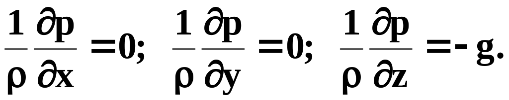 Первые два уравнения указывают на то, что давление не зависит от координат х и у, то есть одинаково во всех точках любой горизонтальной плоскости, а из третьего получим