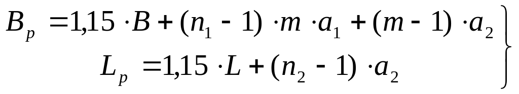 де Вр - розгорнена ширина і довжина екрану, м; В, L - ширина і довжина площі, що перекривається, екраном; n1 - кількість плівкових смуг в одному полотнищі; m - кількість полотнищ в екрані по ширині майданчику; n2 - кількість полотнищ, що укладаються по довжині майданчику; a1 - ширина нахльостування при зварюванні смуг між собою, м.