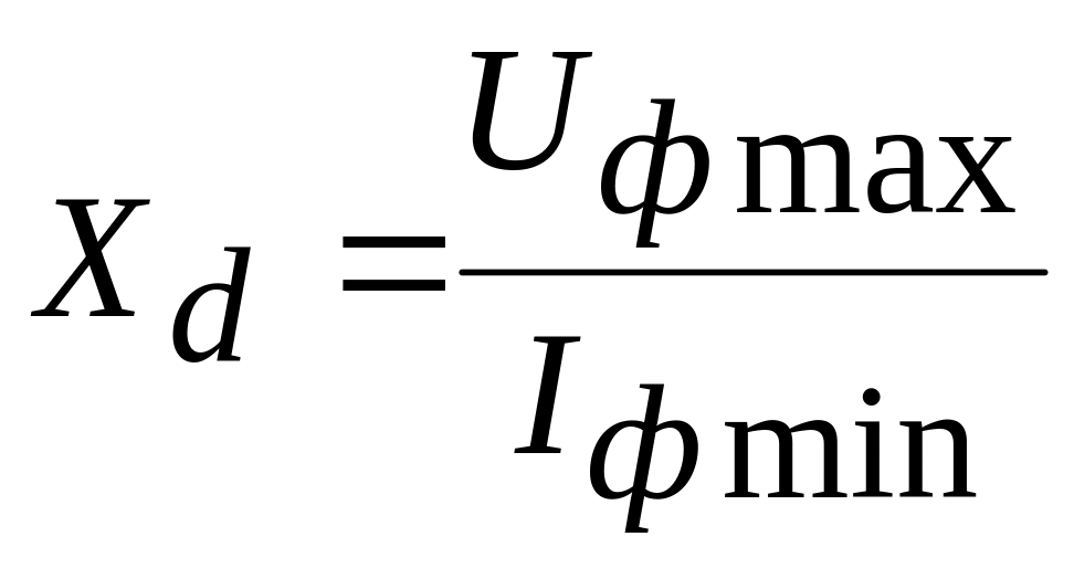Повільно обертая ротор рукою, установити його “повздовжнє” положення, при якому струм обмотки збудження буде найбільшим. Регулюючи напругу АТ, установити струм у обмотці статора максимальним. По величині виміряної напруги і максимальному значенню струму статора визначити значення перехідного індуктивного опіру продольної вісі по формулі: