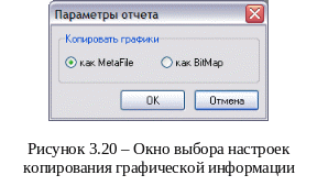 При копировании графиков возможен выбор представления, в каком будут копироваться графики – в виде метафайла (*.wmf) или в виде растра (*.bmp), рисунок 3.20. Эта возможность реализована из главного меню Инструменты–Параметры копирования. Выбор представления зависит от возможностей Вашего принтера и определяется экспериментально.
