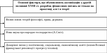 У ХVІІІ ст. фінансові теорії знаходять повніший розвиток завдяки успіхам політичної економії, піднесеної до рангу науки А. Смітом у його праці «Дослідження про багатство народів» (1776 р.). Він не виділяв фінансову науку, але розвинув економічну основу фінансового господарства. |