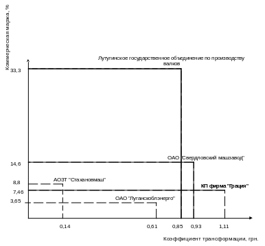 Если обратиться к табл. 3 и 4, то при сопоставлении приведенных в них и рис. 1 данных видно, что такие предприятия, как КП фирма "Грация", ОАО "Свердловский машиностроительный завод" и Лутугинское государственное объединение по производству валков находятся в нормальной зоне, тогда как ОАО "Луганскоблэнерго" пребывает в опасной зоне. Если такие факторы, как фондоемкость производства, определяемая отраслевой принадлежностью предприятия, или ценовая политика, осуществляемая предприятием подчас вынужденно, мало зависят от предприятия, то предприятия располагают определенной свободой маневра для усиления коммерческой маржи, воздействуя на себестоимость, снижая затраты периода, упорядочивая накладные расходы.