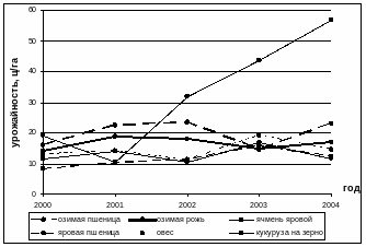 Рис. 3 Динамика урожайности зерновых культур Саратовской области за период 2000-2004 гг.