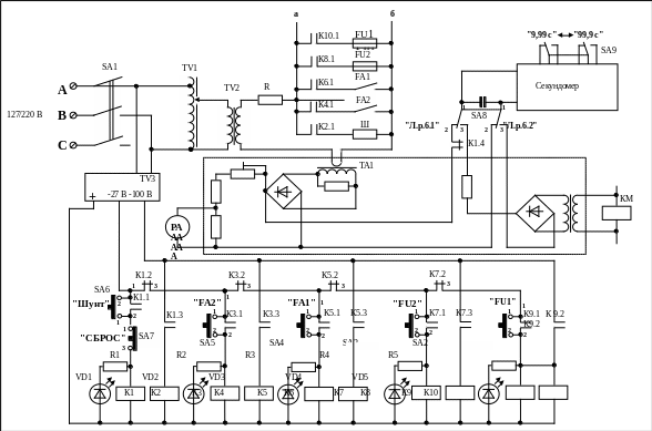 Исследование работы аппаратов защиты и регулировка тока уставки тепловых реле магнитных пускателей осуществляется на лабораторном стенде, принципиальная электрическая и блок-схема которого представлена на рис. 14.