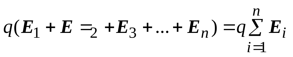 где Е1 – напряжённость поля, созданного зарядом q1 в точке расположения заряда q, Е2 – напряжённость поля, созданного там же вторым зарядом, Еi – напряжённость поля, созданного i – м зарядом в точке расположения заряда q.