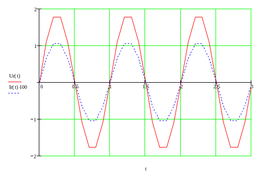 Строим осциллограммы и векторные диаграммы тока и напряжения на активном сопротивлении:
