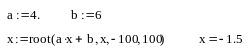 Пример. Найти корень уравнения a*x-b=0, где a=4, d=6. В программе Мathcad эта запись будет выглядеть следующим образом