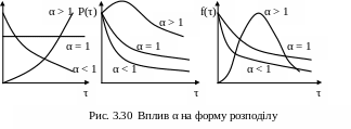 Параметр α визначає форму розподілу: при α = 1 він перетворюється в експоненціальний; при α > 1 функція надійності описує обладнання зі швидким зношуванням; при α < 1 – при дії на обладнання інтенсивних пікових навантажень. Характер інтенсивності відмов λ(τ), імовірності безвідмовної роботи Р(τ) і густини імовірності f(τ) якісно при різних значеннях α показано на рис. 3.30.