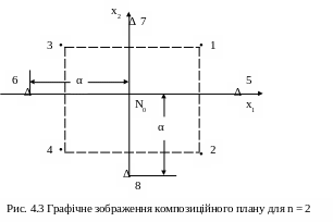 Точки 1, 2, 3, 4 утворюють ПФЕ 2n; точки 5, 6, 7, 8 - “зоряні” точки з координатами (±α; 0) та (0; ±α) ; в центрі плану знаходиться точка нульового рівня з координатами (0; 0).