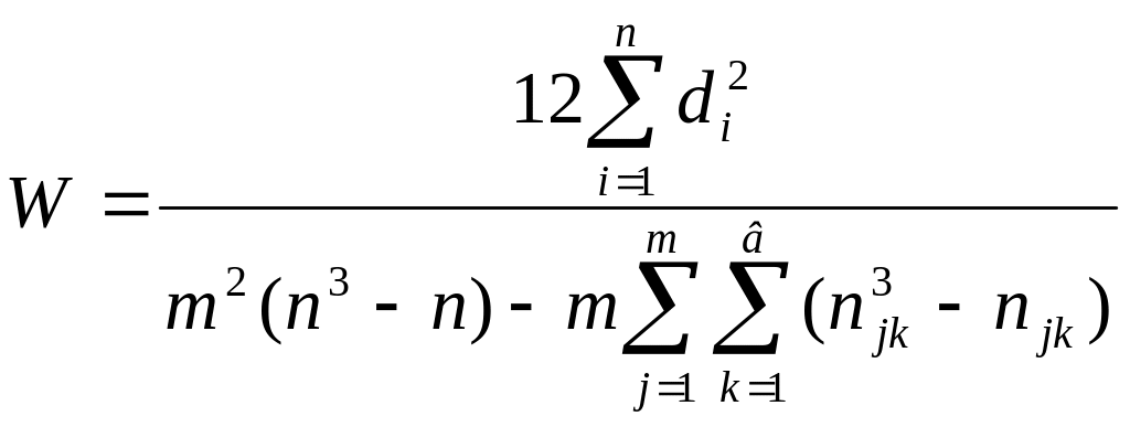 де njk – кількість об’єктів зі збіжними рангами в кожній к – тій групі у j – того експерта;
