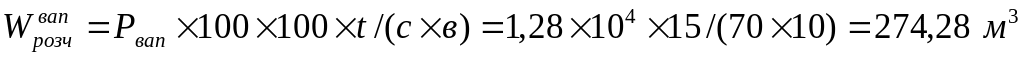 Wрозч = Рз × 100 × 100 × t /с × в = 0,51 × 104 × 30 / (60 × 30) = 85,0 м3, (7.45)