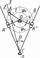 При синтезе многих механизмов задается коэффициент изменения средней скорости ведомого звена, по которому определяют угол перекрытия β: β=180˚∙(К-1) / (К+1). (2.14)