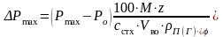 де Рmaх – максимальний тиск вибуху стехіометричної ГПС (ППС) у замкнутому об’ємі, визначається за довідником. Якщо дані відсутні, то приймають Рmaх = 900 кПа; Р0 – початковий тиск у приміщенні, кПа (приймають Р0 = 101кПа); М – маса ГПС (ППС), що потрапила у приміщення в наслідок аварії, т; z − коефіцієнт участі пальної речовини у вибуху в приміщенні, дорівнює: 0,5 − для пальних газів, промислового пилу; 0,3 − для легко займистої речовини (ЛЗР) і пальних рідин, нагрітих до температури спалаху та вище та при температурі нижче температури спалаху при утворенні аерозолю; Vво − вільний об’єм приміщення, м3, що складає 80% від загального об’єму; − коефіцієнт негерметичності приміщення та неадіабатичності процесу горіння, прийняти рівним 3; п(г) − щільність пари (газу) при Р0, кг/м3, визначається залежністю: