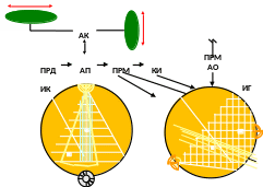 Радиолокационные сигналы пассивного канала диспетчерской и посадочной РЛС через входной кабельный кросс поступают на ШСО. В ШСО происходит отработка радиолокационных сигналов, формирование сигналов масштабных меток дальности и азимута, отметок положения антенн ПРЛ и трансляции сигналов на входы индикаторов, установленных на пультах рабочих мест, а также на контрольные индикаторы: ИКО и комбинированный индикатор ПРЛ, установленные в ПЕСО.