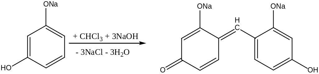 ВР – 2007. Реакция конденсации с хлороформом в щелочной среде. Происходит при нагревании резорцина с 10 М NaOH в присутствии хлороформа. Появляется темно-красное окрашивание, переходящее в бледно-желтое окрашивание, переходящее в бледно-желтое при подкислении HCl.
