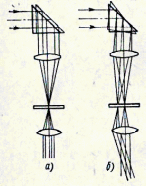 ризмы и плоские зеркала обычно применяют в приборах для измерения направления оптической оси системы (например, в перископических приборах), для поворота изображения на некоторый угол (например, призменная система бинокля). Призмы и зеркала устанавливают в параллельных пучках (перед объективами телескопических приборов) или в сходящихся пучках (за объективами). Часто призмы и зеркала устанавливают во вращающиеся оправы, что обеспечивает изменение направления оси визирования при неподвижном корпусе.В зависимости от места расположения призмы неправильная ее установка оказывает различное влияние на ход лучей в приборе. На рис. 19.3. показано два случая неправильной установки призмы работающей в параллельных пучках. При малом параллельном смещении призма (рис. 19.3, а) происходит лишь смещение пучка лучей, выходящих из призмы, что может привести к небольшому срезанию пучка лучей в приборе. Это смещение призмы не оказывает влияния на работу прибора.