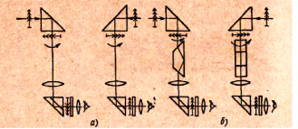 Поворот изображения компенсируют введённой в схему прибора призмы Дове (в параллельных пучках – перед объективом) или призмы Пехана (за объективом, в сходящихся пучках лучей).