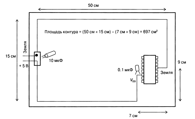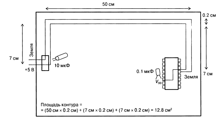 На рис. ПБ2 приведён пример разводки печатной платы с неудачным размещением шин питания и земли. Площадь, ограниченная замкнутым контуром, показанным на рис. ПБ2, равна 697 см2. Сам контур может послужить отличной антенной, так что такая плата сможет принимать сигналы радиостанций.