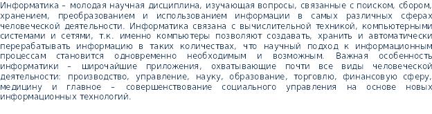 Многие ученые подчеркивают, что информатика имеет черты технических и гуманитарных наук. Черты технической науки придают информатике ее аспекты, связанные с созданием и функционированием машинных систем обработки информации. А.А. Дородницын определяет состав информатики как 3 неразрывно и существенно связанные части: технические средства, программные и алгоритмические. Науке информатике присущи некоторые черты гуманитарной (общественной) науки, что обусловлено ее вкладом в развитие и совершенствование социальной сферы. Таким образом, информатика является комплексной, междисциплинарной отраслью научного знания. |