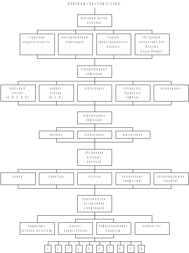 1 – алкоголь, 2 – лекарственные препараты, 3 – токсины, 4 – системная красная волчанка и другие аутоиммунные нарушения, 5 – липоидоз (болезнь Гоше), 6 – амилоидоз, 7 – гемохроматоз, 8 – дефицит 1-антитрипсина, 9 – саркоидоз, 10 – лимфогранулематоз.