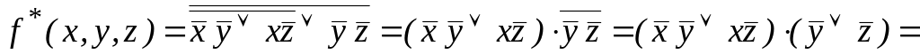 Чтобы получить двойственную функцию из исходной, надо каждой переменной придать отрицание на самом нижнем уровне формулы, затем общее отрицание всей формуле (на самом верхнем уровне) и привести к ДНФ (упростить).