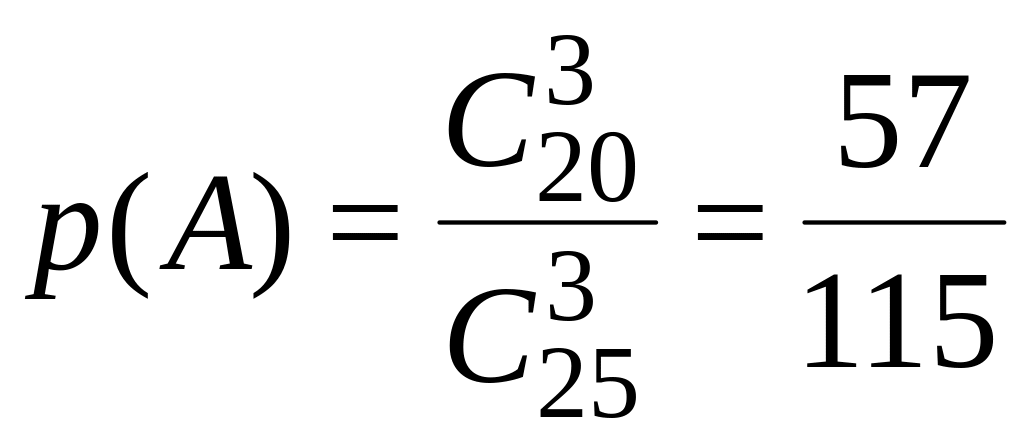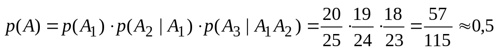 Пример 3. Студент пришел на экзамен, зная лишь 20 из 25 вопросов программы. Экзаменатор задал студенту 3 вопроса. Найти вероятность того, что студент знает все эти вопросы.