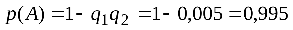 Пример 4. Для сигнализации о возгорании установлены два независимо работающих датчика. Вероятности того, что при возгорании датчик сработает для первого и второго датчиков соответственно равны 0,9 и 0,95. Найти вероятность того, что при пожаре сработает: а) хотя бы один датчик; б) только один датчик.