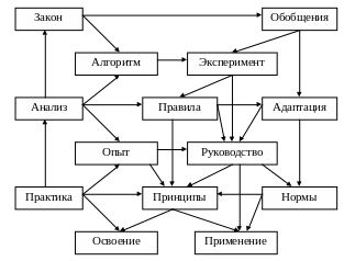 В реальной жизни, теории и практике построения, функционирования и развития процессов и систем использование полученных знаний осуществляется в виде разработки, освоения и применения принципов, форм, свойств и других категорий, определяющих содержание организации.