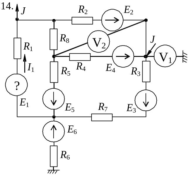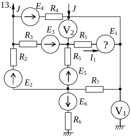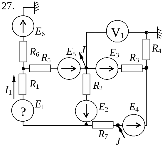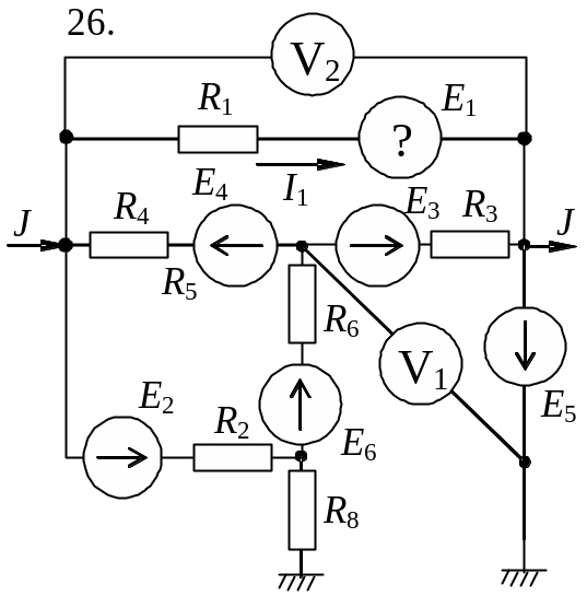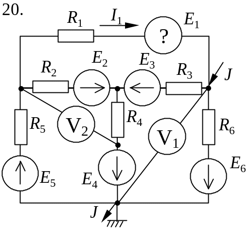 Вольтметр V1 показывает разность потенциалов между точками G и А цепи. По второму закону Киргофа I3R3 + UGA =E3+ E6 . При этом G=H;, т.к. в шестой ветви ток равен нулю.