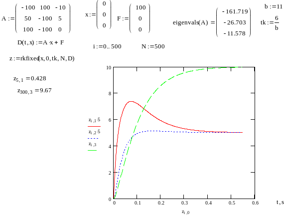 4. Используя программу MATCAD 8.0, и имеющуюся в ней функцию rkfixed (x, 0, tk, N, D) решим систему дифференциальных уравнений методом Рунге-Кутта. Выберем N=500 точек. Для оценки времени счета tk, найдем корни характеристического уравнения, используя функцию eiqenvals(A).