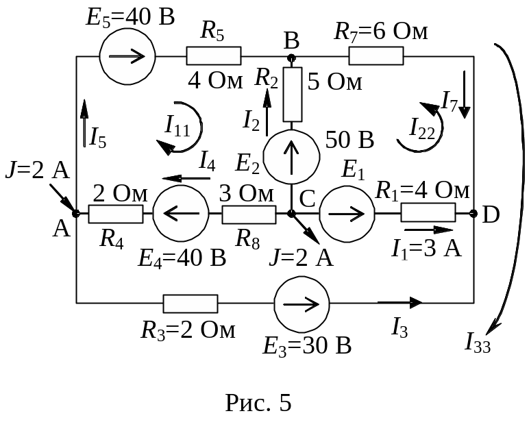 Рисуем расчетную схему цепи (рис. 4), на которой показываем выбранные и известные положительные направления всех токов и ЭДС, а также направления обходов контуров.