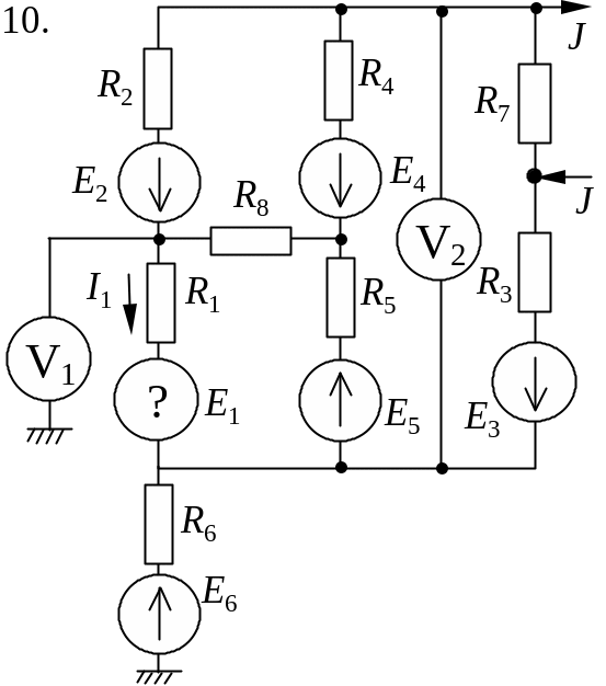 Если заменить источник тока J эквивалентным источником ЭДС EU=(R4+R8)J=52=10 B, то электрическая цепь при отключенной второй ветви будет иметь всего два узла А и D.