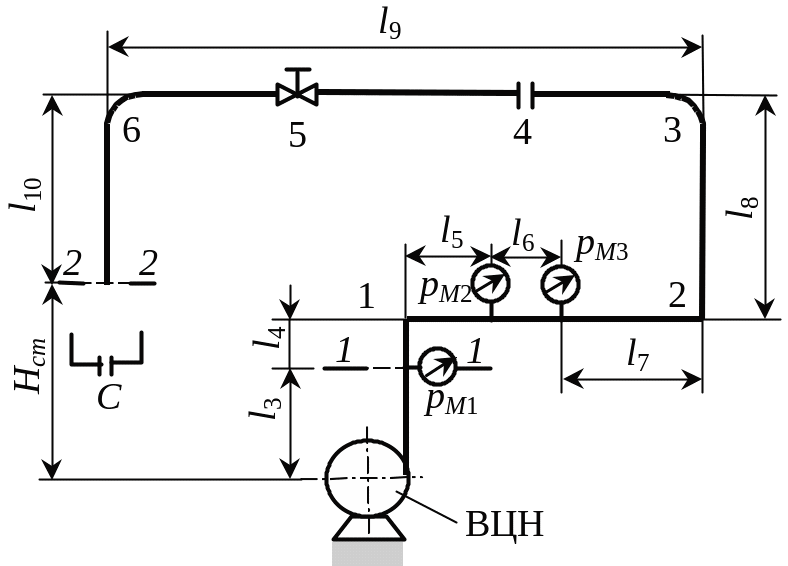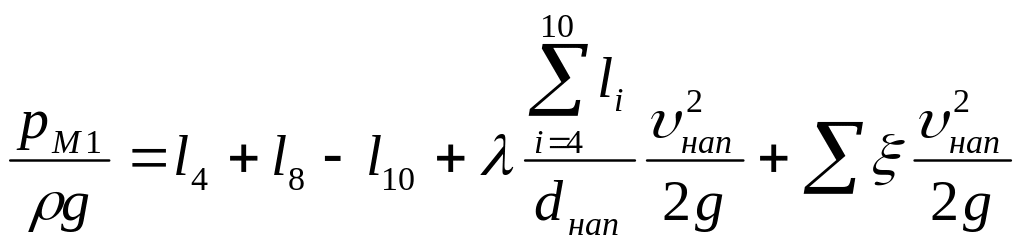 Оскільки всі ці місцеві опори розміщені на напірній лінії після манометра pМ1, то ми можемо використати його покази для визначення сумарного коефіцієнта місцевих опорів. Для цього запишемо рівняння Бернулі для перерізу 1-1, де розміщений манометр, і перерізу 2-2 на виході з напірної лінії: