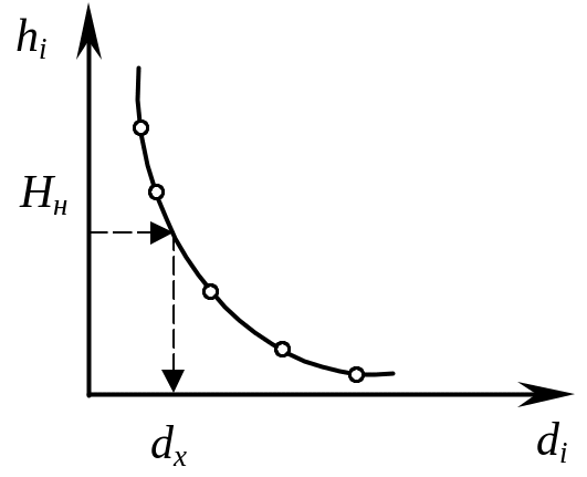Задаємось рядом значень dі (і = 115) і робимо повний гідравлічний розрахунок для кожного діаметра. Орієнтовно можна взяти d1 = 0,7dнап. Крок розрахунку d повинен бути таким, щоб шуканий діаметр dзл опинився поcередині вибраного діапазону діаметрів. Орієнтовно можна взяти d = (dнап – d1)/7.