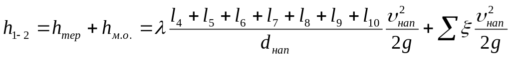 Розраховуємо сумарний коефіцієнт місцевих опорів напірної лінії за формулою, отриманою з рівняння Бернулі для перерізів 1-1 і 2-2 (див. Рисунок 1 .6):
