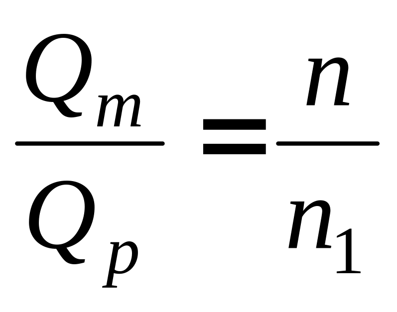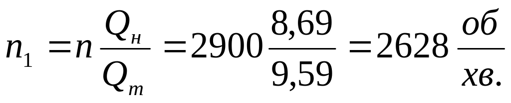 У випадку невідповідності розрахункової робочої точки (Qт Qр і Hт Hр) виконується перерахунок характеристики насоса на нове (понижене) число обертів, використовуючи залежність параметрів насоса від числа обертів. Подача насоса буде досягнута при новому числі обертів n1 і буде зменшуватись у пропорції: