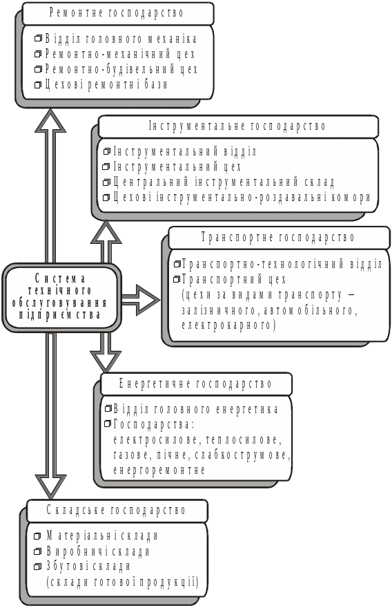 До системи технічного обслуговування виробництва входять відповідні структурні підрозділи підприємства, що підтримують в робочому стані машини, устаткування, забезпечують робочі місця сировиною, матеріалами, енергією; виконують транспортні та інші подібні операції.