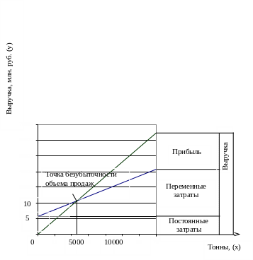 По оси абсцисс (по горизонтали) показан объем продаж в тоннах (можно было бы использовать иные единицы измерения, в том числе деньги). По оси ординат (по вертикали) показаны выручка и ее составные части - постоянные и переменные затраты, а также прибыль. Пересечение кривых, отражающих выручку и себестоимость проданной продукции, позволило определить точку безубыточности объема продаж.