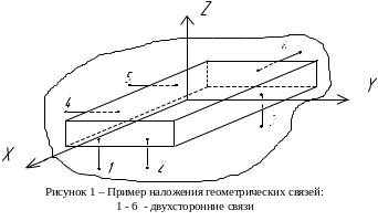 При наложении геометрических связей тело лишается трех перемещений вдоль осей ОХ (связь №6), ОУ (связи №4 и №5), OZ (связи №1, №2 и №3) и трех поворотов вокруг этих осей (связи №1, №2 и №3 - вокруг осей OX и OY и связи №4 и №5 - вокруг оси OZ), т.е. тело становится неподвижным в системе ОХУZ.