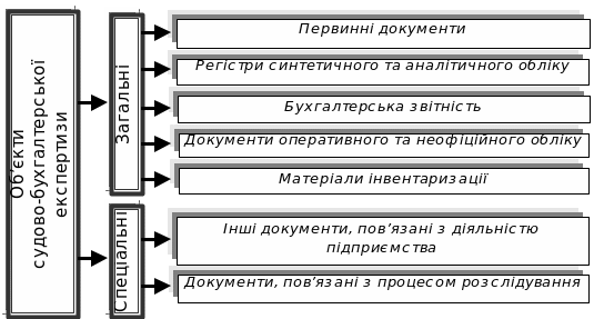 У зв’язку з тим, що експерт-бухгалтер повинен досліджувати не тільки бухгалтерські документи, але й інші матеріали наданої кримінальної чи цивільної справи, розрізняють загальні та спеціальні об’єкти судово-бухгалтерської експертизи (рис. 2.1).
