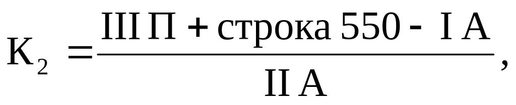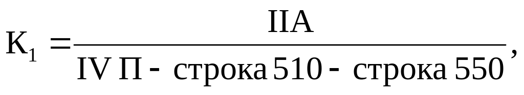 1. Коэффициент текущей ликвидности (К1) на конец отчетного периода рассчитывается по приведенной ниже формуле как отношение итога раздела II актива баланса к итогу раздела IV пассива баланса за вычетом строки 510 «Долгосрочные кредиты и займы» и строки 550 «Резервы предстоящих расходов»:
