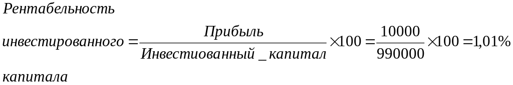 Рентабельность инвестированного капитала показывает эффективность инвестиций, насколько успешно предприниматель использовал свой инвестированный капитал, равный 990000 руб., т.е. насколько хорошо он распорядился своими средствами для получения прибыли. Хотя другой показатель – прибыль от продаж (равная в данном примере 1%) – менее важен, но он говорит о том, насколько эффективно он вел свое дело, т.е. сколько получил в виде прибыли сверх каждого рубля от продаж.