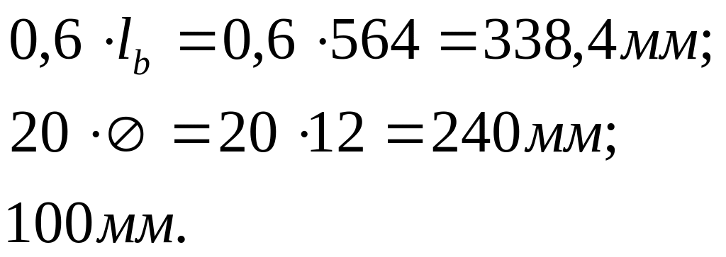 Сечения, в которых обрываемые стержни не требуются по расчету, проще всего определить графически. Для этого необходимо на объемлющую эпюру моментов наложить эпюру арматуры. Точки, в которых ординаты эпюр будут общими (точки пересечения), определят места теоретического обрыва стержней в пролете. Для обеспечения прочности наклонных сечений второстепенной балки по изгибающим моментам обрываемые в пролете стержни продольной арматуры необходимо завести за точку теоретического обрыва на расстояние не менее: