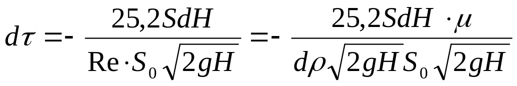 При решении задачи о времени опорожнения сосуда, площадь поперечного сечения которого изменяется по высоте (например, при истечении из конических резервуаров, цистерны и др.) в процессе интегрирования должна быть учтена зависимость площади сечения S от уровня H жидкости.