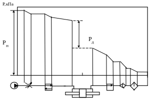 Побудувати лінію абсолютного тиску в гідроприводі. Побудову виконати за результатами розрахунків, наведених у п. 4.2.1, 4.5.3, 4.5.4. Утрати тиску в колінах, трійниках і т.п. додати до утрат у розподільнику.